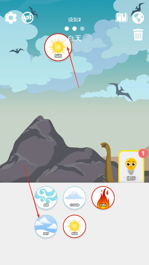 2、合成天空后会变成一个全新的元素,将新合成的太阳元素和天空元素合在一起就是新的白天元素。