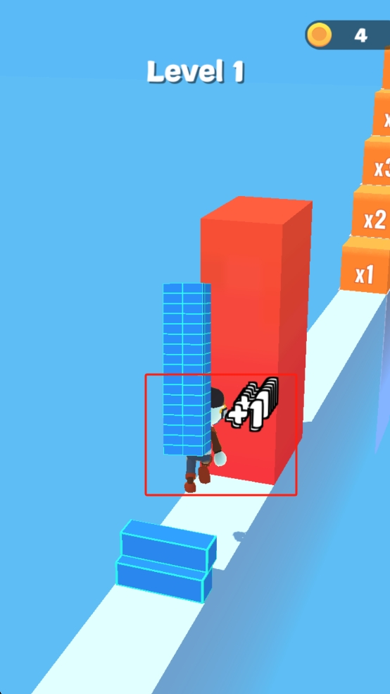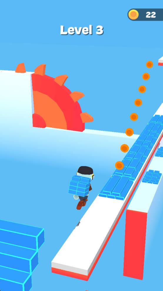 2、奔跑中遇到蓝色方块,靠近自动收集,同时留意红色高台,借助跳跃或绕路通过,避免砖块掉落碎裂。
