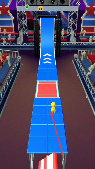 1、操控黄色角色沿赛道奔跑,跟随箭头指引,保持路线,避开赛道障碍,向终点冲刺,控制速度。