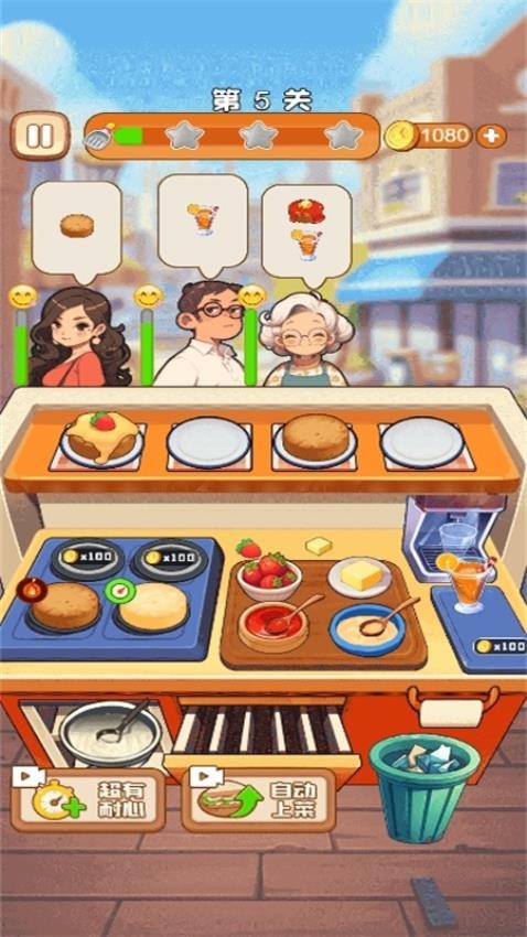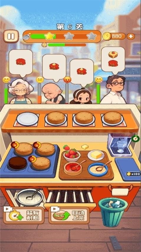 1、基础模式包含100个渐进式关卡,从早点摊起步,逐步发展为美食广场。每个关卡设有铜、银、金三级评价标准,完美通关需要精确的时间管理。