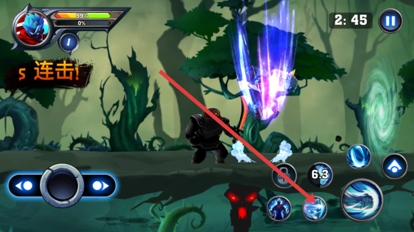 2、右手观察技能冷却,连招衔接用最基本的按键补刀,出现最高5连击时,释放出伤害来攻击对手。