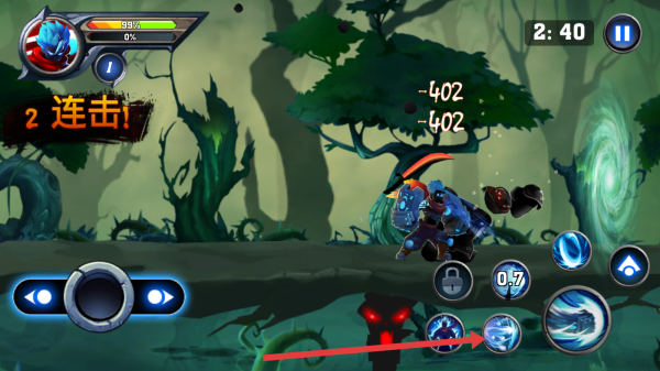 3、留意场景中隐藏威胁,如地面暗桩 ,血量感觉到不太够时,点击左边的走位按键技能拉开距离,稳扎稳打前进。