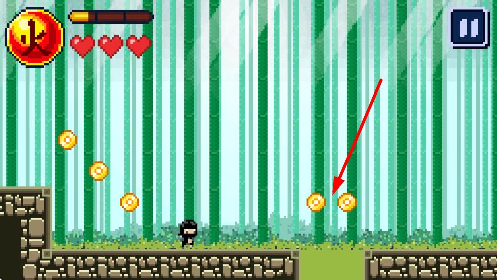 2、2、在竹林场景,控制忍者移动,收集金币,注意避开危险。