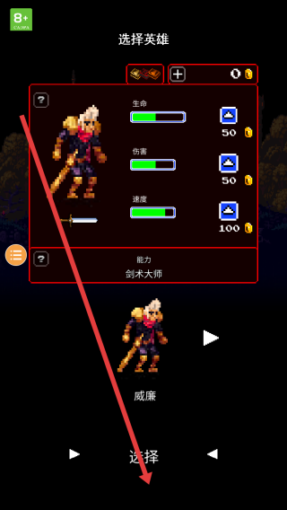 1、选威廉英雄或者自己感兴趣的英雄角色,确认生命、伤害、速度后点击选择该玩家,进入战斗模式。
