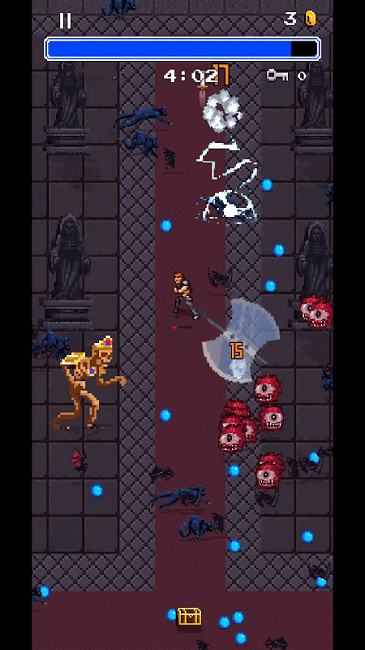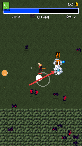 2、战斗时滑动屏幕控制移动,主动攻击蝙蝠,并注意蝙蝠攻击,靠近敌人自动攻击,拾取武器强化。