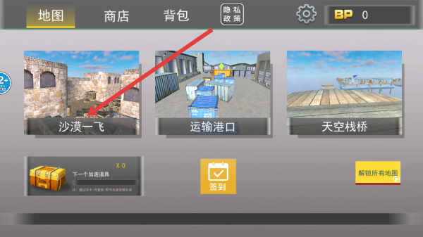 1、地图界面选场景,如沙漠一飞,进入游戏后,滑动虚拟摇杆控制角色移动,熟悉操作。