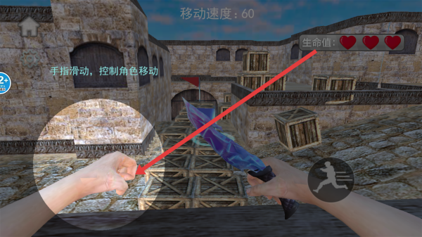 2、留意移动速度和生命值显示,利用场景还有木箱、建筑来躲避危险,推进关卡和移动速度。