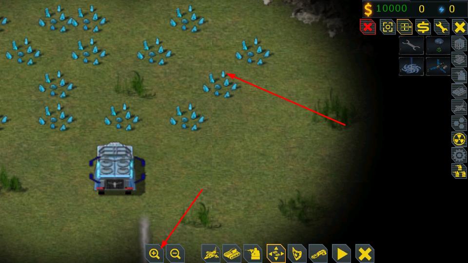 3、玩家按指示点击放大按钮观察资源点,控制单位采集蓝色晶体,积累资源,合理规划发展操作。