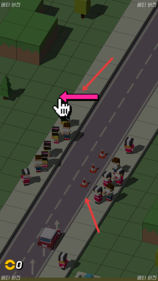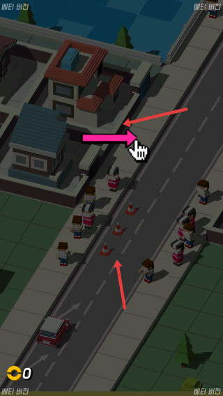 1、操控红色汽车在城市道路行驶,根据箭头指引,前往有行人排队的区域,如道路施工段。