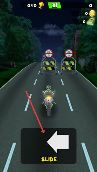 1、点击SLIDE左右滑动,操控摩托躲避路障,如双障碍时滑向一侧绕开。