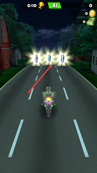 2、行驶中遇发光道具,调整方向撞击拾取,提升摩托性能,继续在夜间道路闯关。