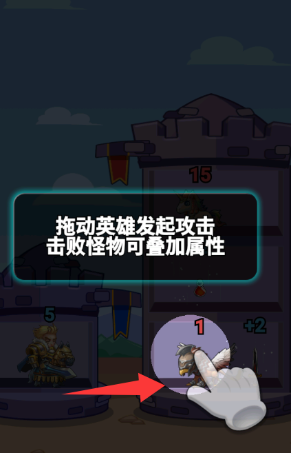 2、拖动英雄发起攻击,击败怪物可叠加属性。