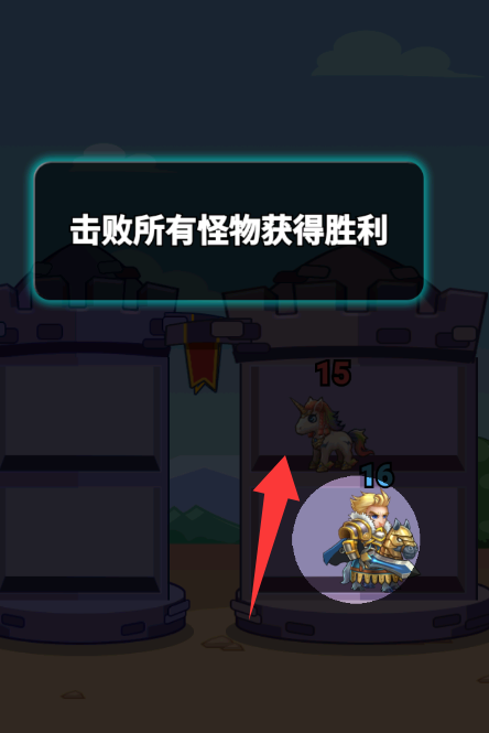 3、拖动角色向上移动击败怪物。