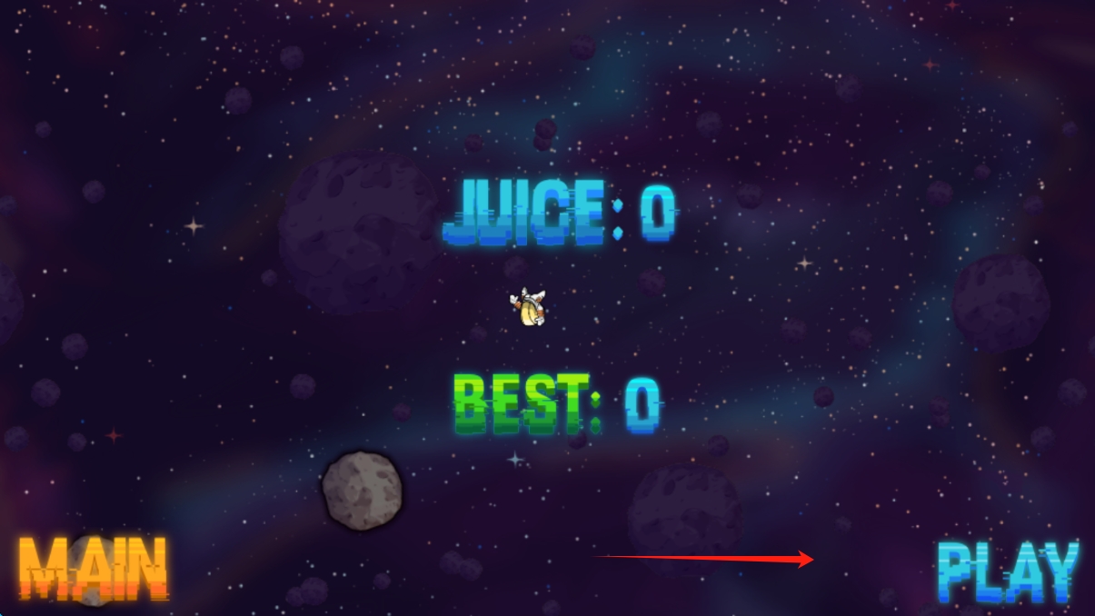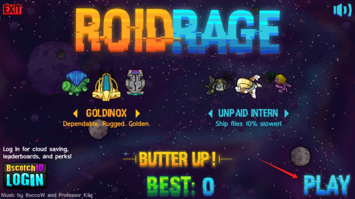 1、在Roid-Rage启动页,点击PLAY,选择飞船与角色,开启太空躲避陨石之旅,点击开始游戏。
