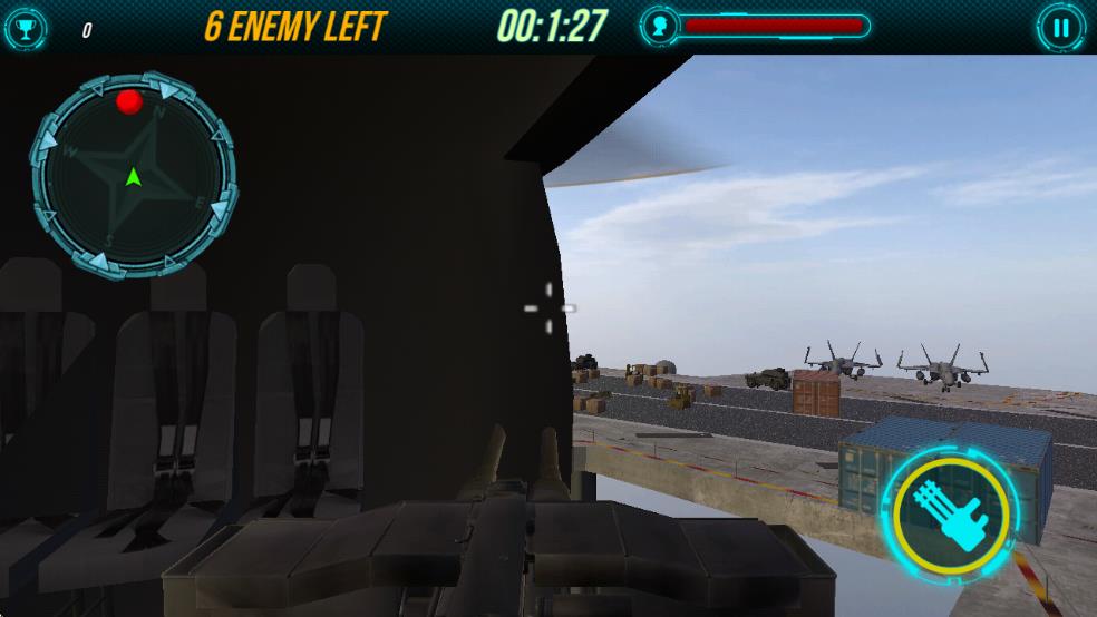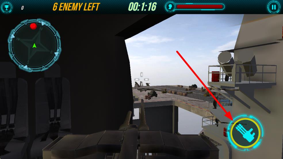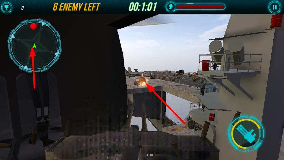 2、在舰艇各处移动,瞄准恐怖分子射击,运用策略避开攻击,收集资源升级火力。