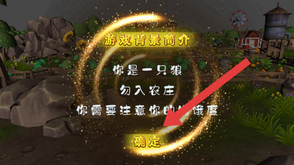 1、游戏设定:玩家扮演狼,勿入农庄,需要注意饥饿度,点击确定的按钮,背景是农庄场景有房屋、风车、绿植等。