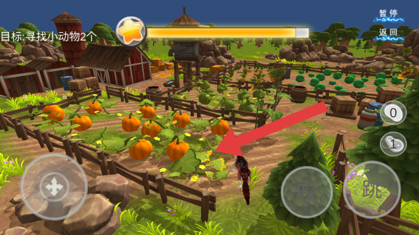 3、根据游戏目标:寻找小动物2个,农场环境有南瓜田、木屋、围栏等,玩家需要在场景中进行移动。