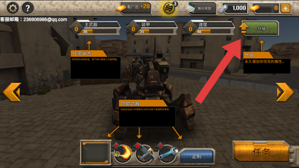 1、功能按钮:升级、任务、定制,还有看广告+20、每日奖励等,点击升级方可升级坦克的属性。