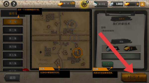 2、情节1及第一集到第六集的剧集选择,地图标注WestPameno区域,任务是我们的新技术测试新拖车,点击战斗!的按钮。