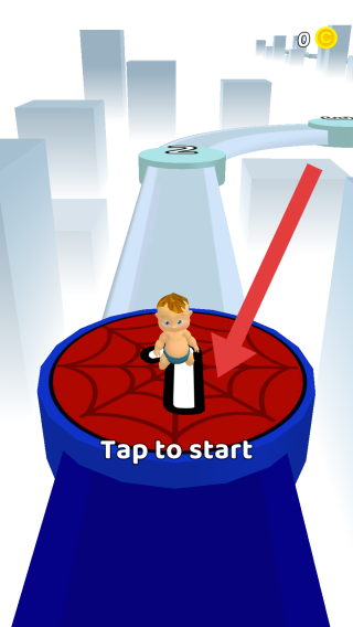 1、画面中有穿着尿布的角色,场景是城市背景的跑道,点击Taptostart文字提示,还有金币等元素。