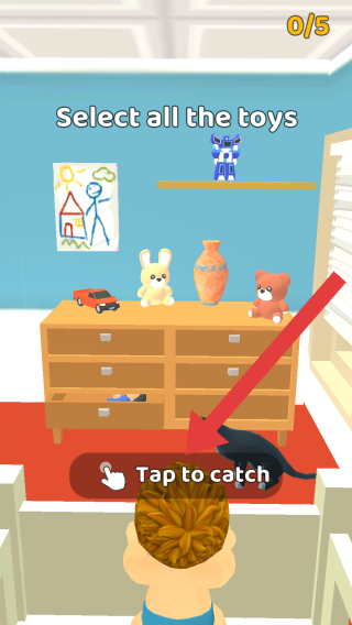 2、游戏任务提示选择所有玩具,需要选择场景中玩家喜欢的玩具,下方有Taptocatch点击捕捉的交互提示。