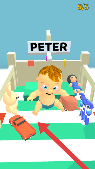 3、显示5/5进度,有写着PETER的标识,表示玩家拿到自己喜欢的玩具后喜悦的状态,代表此关已通过。
