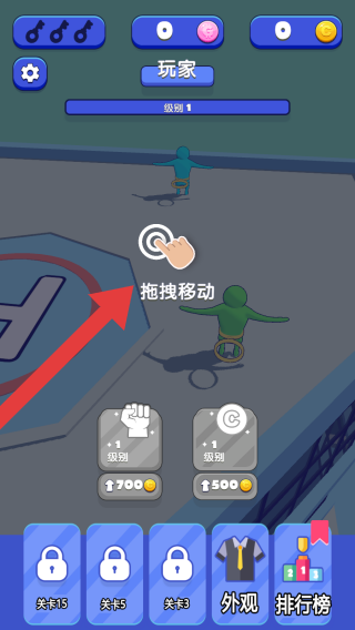 1、根据提示拖拽移动的操作指引,可通过拖拽控制来移动人物,有级别1的技能按钮及升级所需资源。