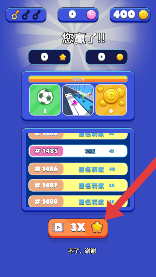 3、显示你赢了!!代表获得本次游戏的胜利,有排名的列表,显示不同编号及玩家匿名玩家身份、对应数值。