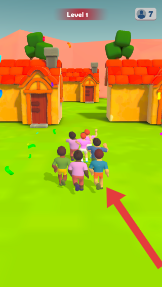 3、画面中有多个颜色各异的玩家结伴前行,显示胜利之后的状态,背景是带有红色屋顶的房屋,周围还有绿色的草地和树木。