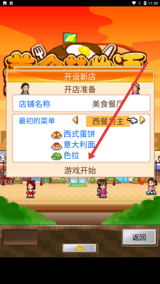 3、在开设新店界面,在确认好店铺名称与初始菜单后,通过点击游戏开始,正式经营美食餐厅。
