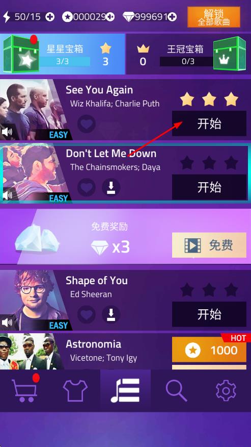 1、进入游戏后,从关卡列表中选一首背景音乐,查看屏幕上的音符轨道,做好准备开启首场节奏挑战。