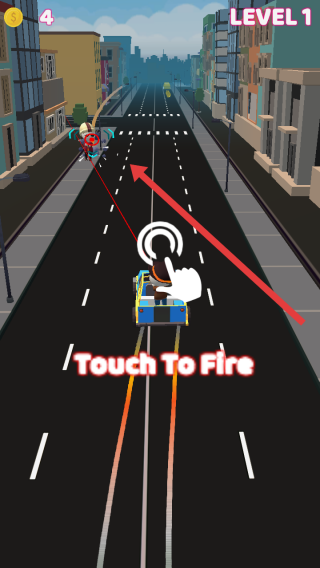 2、进入Level-1赛道,遇到敌人时,按Touch-To-Fire提示点击屏幕射击,消灭前方空中敌人推进关卡。