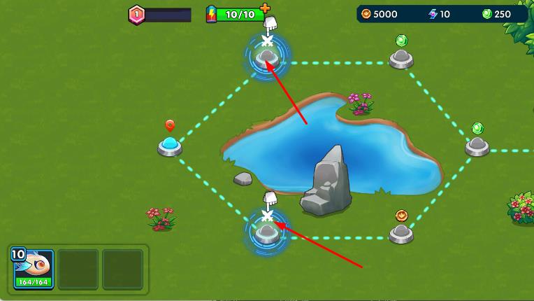 1、在地图界面,点击带箭头标识的据点,派遣宠物前往,触发战斗或探索事件。
