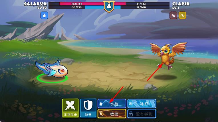 2、进入战斗,操控宠物使用正常攻击,也可选择其他技能,水枪,冰钉等,攻击敌方宠物,消耗其血量。