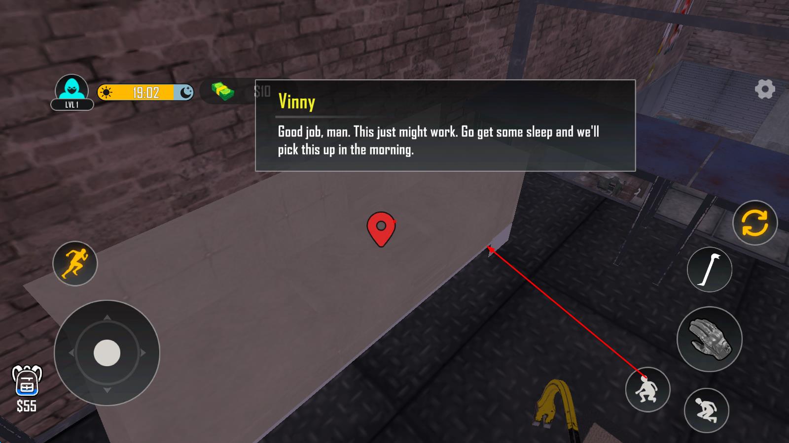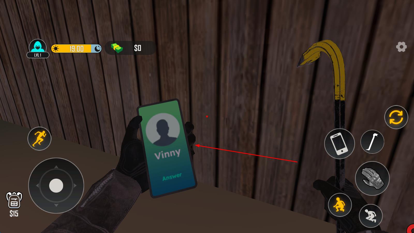 1、下载打开游戏后点击“Tap to start”开始,左侧按钮控制方向,右侧按钮分别负责蹲下、跳跃和拾取,拿起撬棍后按转换按钮切换,用其破除栅栏开启潜入。