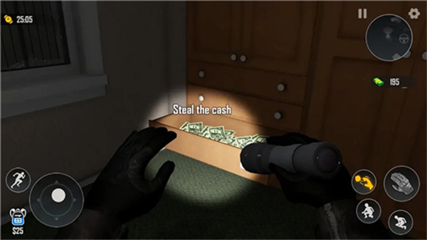 2、潜入盗窃操作:通过开锁小游戏进入房间,控制声响避免被发现,在限时内快速搜刮值钱物品,遇突发情况及时躲藏或逃离。