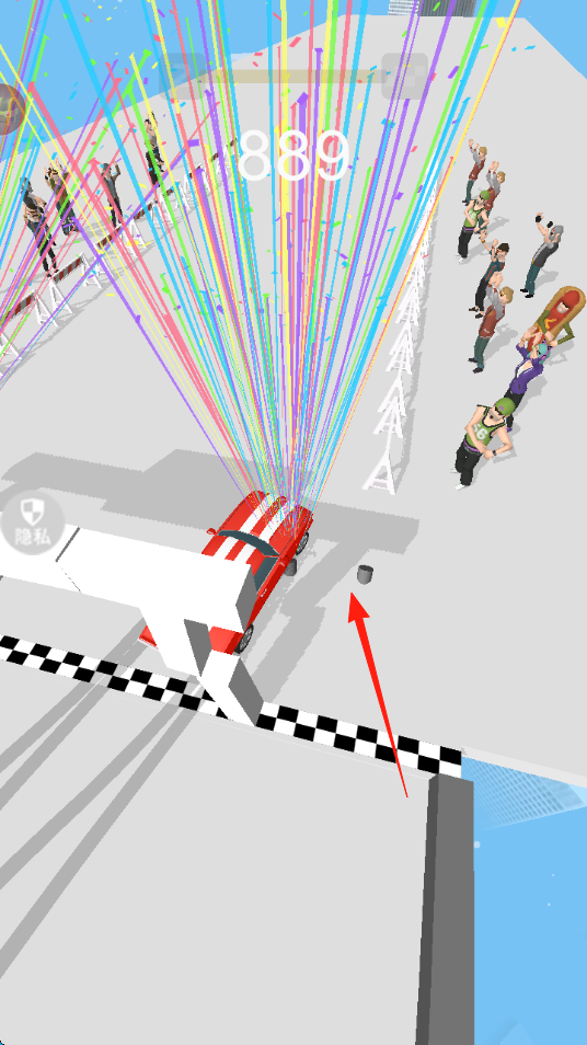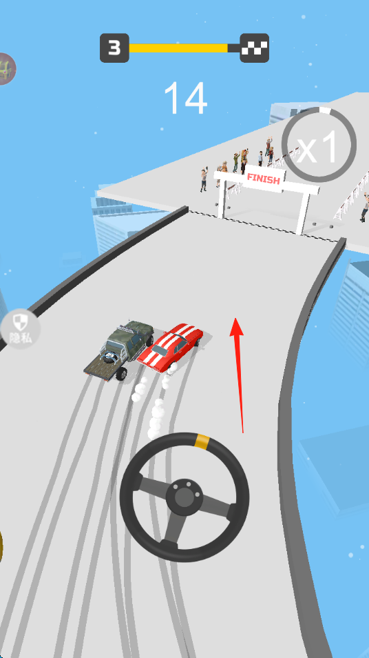2、行驶中遇绿色对手车,观察其行驶节奏,在直道或对手减速时,加速从一侧超车,沿箭头冲向终点,拉开差距。