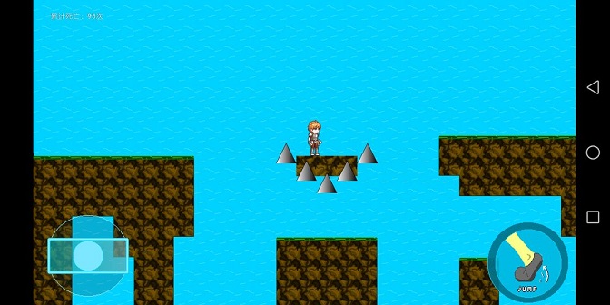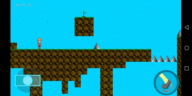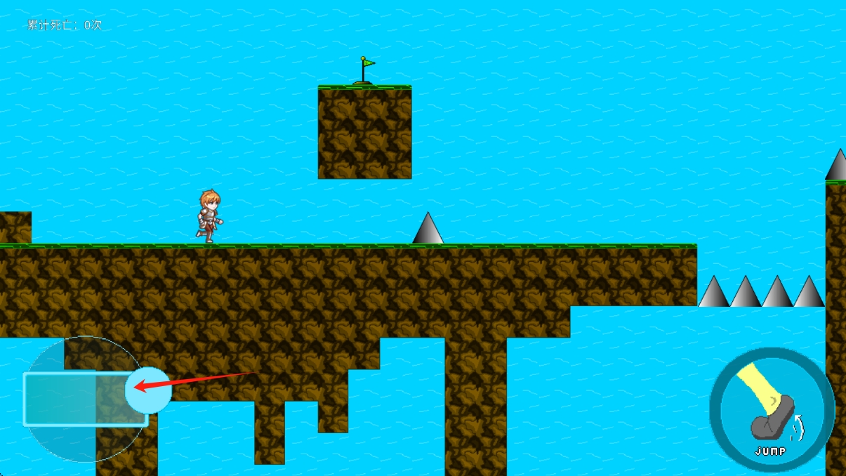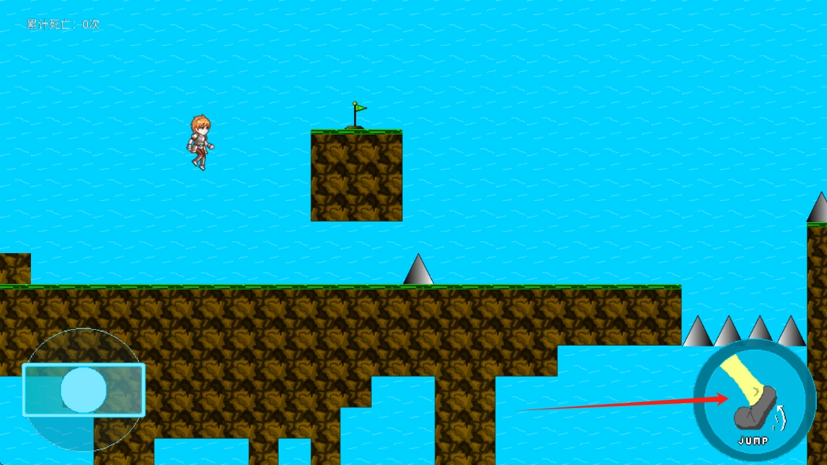 3、遇到沟壑或尖刺,点击右侧JUMP按钮跳跃,抵达旗帜位置通关,点击按钮跳跃。