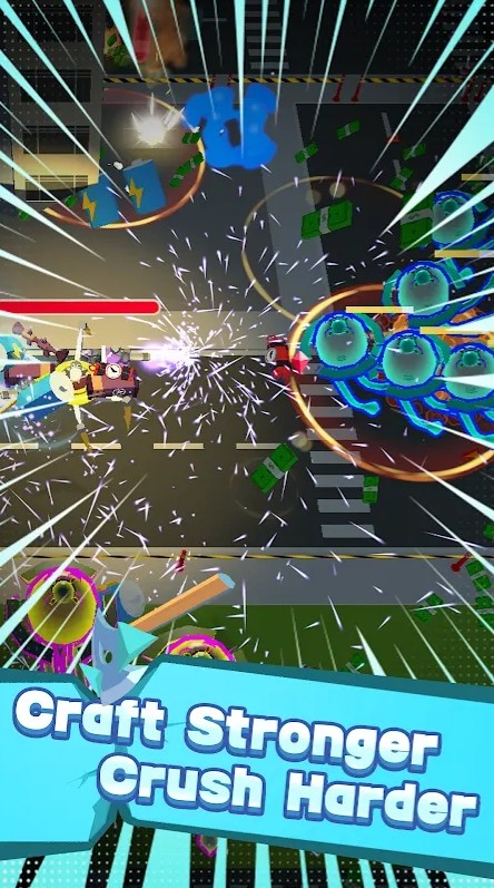 2、多样武器获取:摧毁建筑与敌人可获随机武器箱,内含近战刀片、激光炮等模块,丰富战斗手段提升破坏效率。