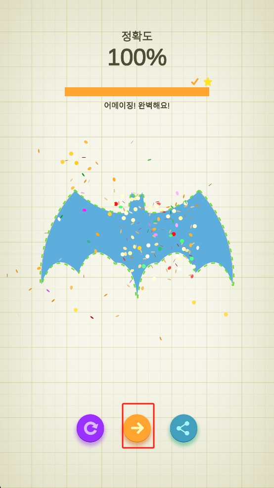 3、当我们完成拼图后,界面出现庆祝特效,点击下方橙色箭头按钮,可进入下一个拼图关卡继续挑战。
