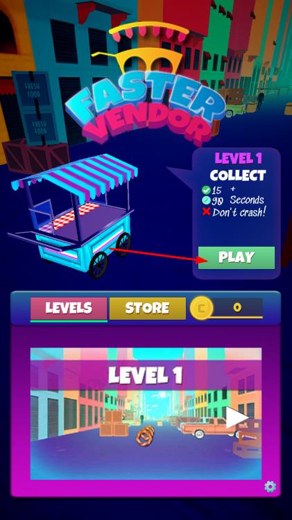 1、在主界面,点击PLAY开始关卡1,操控街头推车在道路行驶。