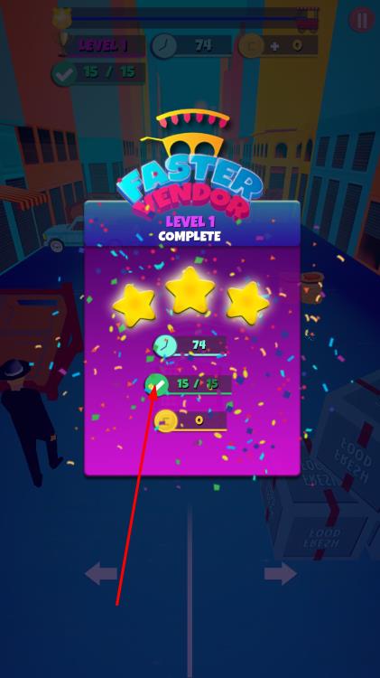 3、完成收集目标,显示LEVEL1 COMPLETE,获取星级评价,进入下一关或商店升级。