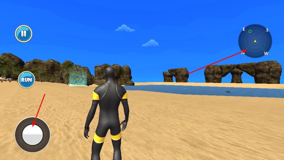 2、在沙滩场中通过左侧摇杆操控角色移动,借助右上角雷达,为探索路线规划奠定基础。