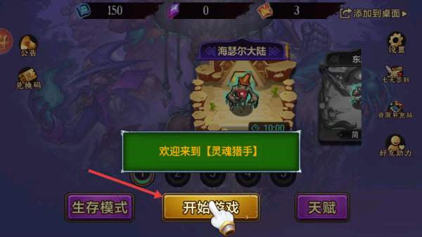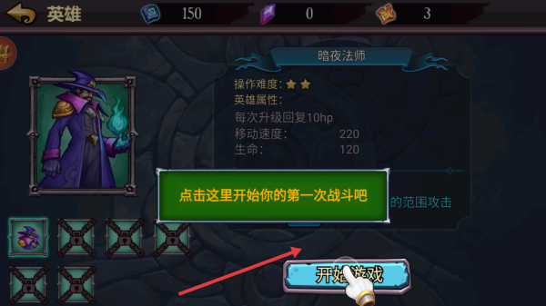 1、主界面点击开始游戏,进入英雄选择,选暗夜法师等开启首战,熟悉战斗流程。