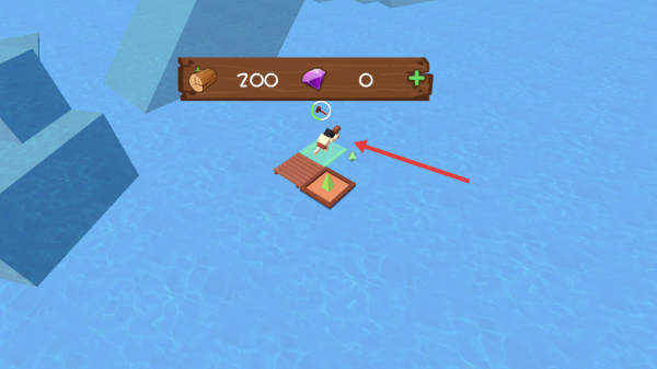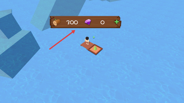 1、操控角色游向木筏,靠近后登上,熟悉初始木筏空间与资源显示木材、紫色矿石计数。