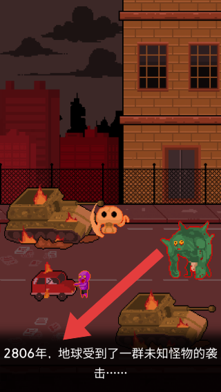 1、呈现2806年,地球受到一群未知怪物的袭击……的末世背景,通过复古像素画面展现末日怪物侵袭的世界观设定。