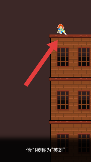 2、玩家是站在建筑顶端的英雄,结合像素画风、建筑场景,是复古平台跳跃、打怪闯关类,以英雄为主角展开冒险,用于呈现英雄设定与世界观。