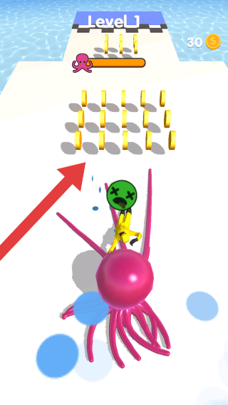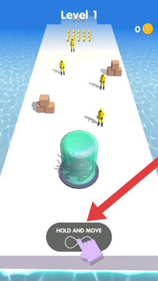 1、玩法提示为HOLDANDMOVE按住并移动,玩家需操控装有章鱼的容器,在路径上躲避黄色敌人、障碍,收集金币。