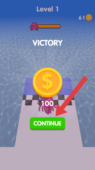 3、达成VICTORY胜利,获得100金币奖励,点击CONTINUE可进入下一关,属于趣味跑酷流程场景。