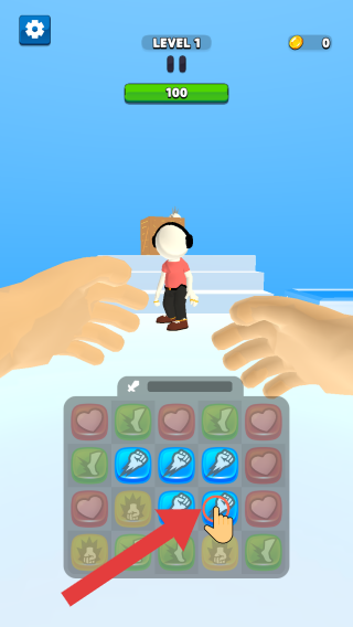 2、角色头顶显示血量100,战斗数值15,下方是可合并的技能/道具方格,有2x等标识,通过合并相同图标强化能力来战斗闯关。